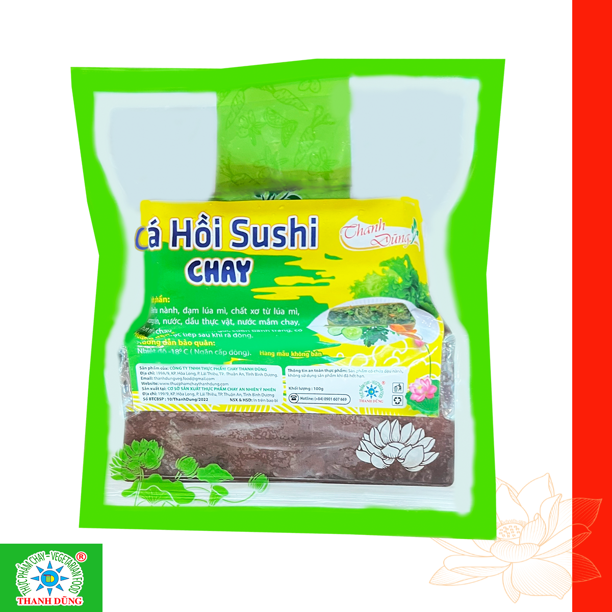 Sản phẩm cá hồi Sushi chay Thanh Dũng là lựa chọn hoàn hảo cho những ai yêu thích ẩm thực sushi mà không muốn sử dụng sản phẩm từ động vật.
