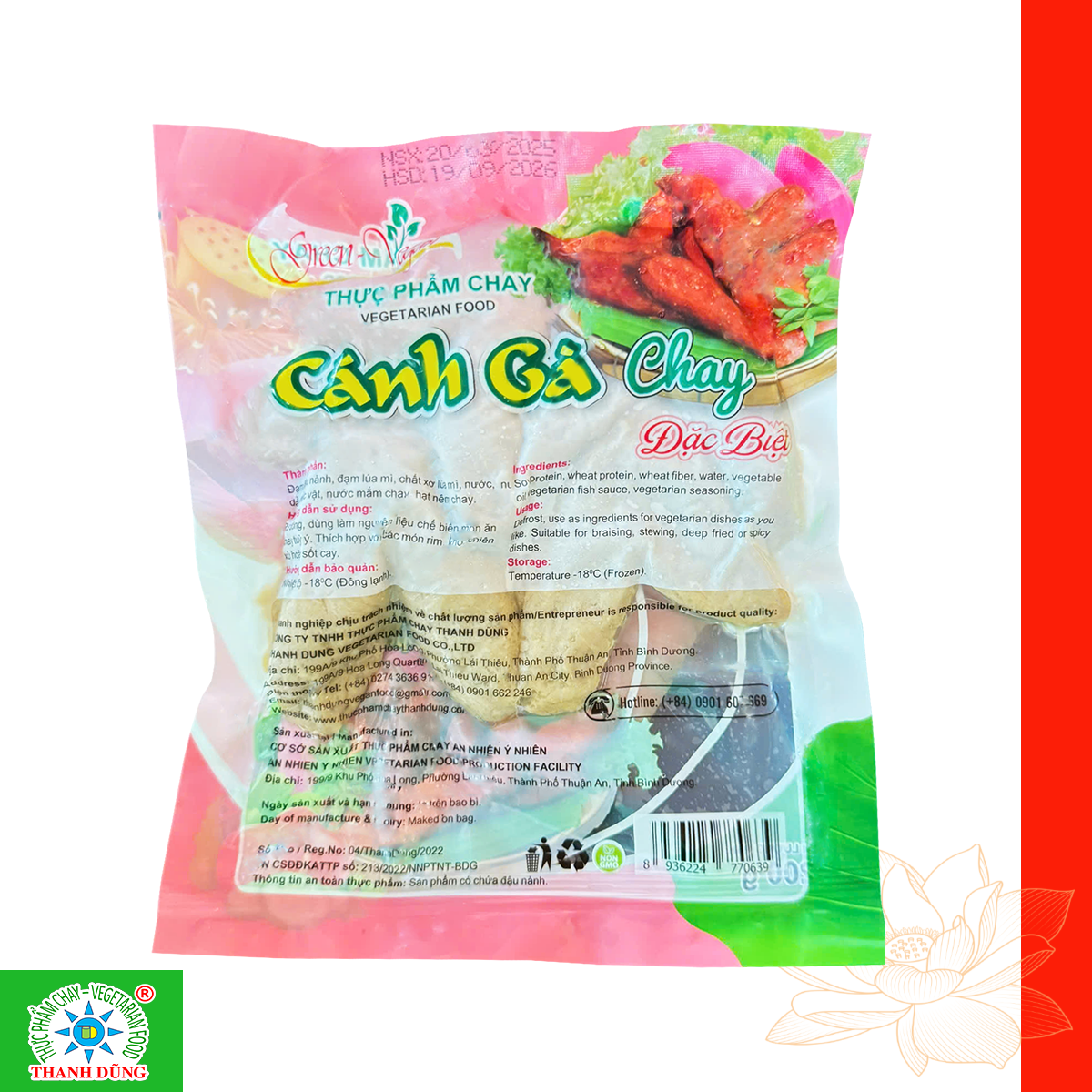 Cánh gà chay Thanh Dũng được chế biến với thành phần chủ yếu là đạm đậu nành, một nguồn tuyệt vời của protein thực vật. Bổ sung bột lúa mạch và bột kem giúp tăng cường giá trị dinh dưỡng, giúp bạn có một bữa ăn chay đầy đủ dinh dưỡng và thơm ngon.